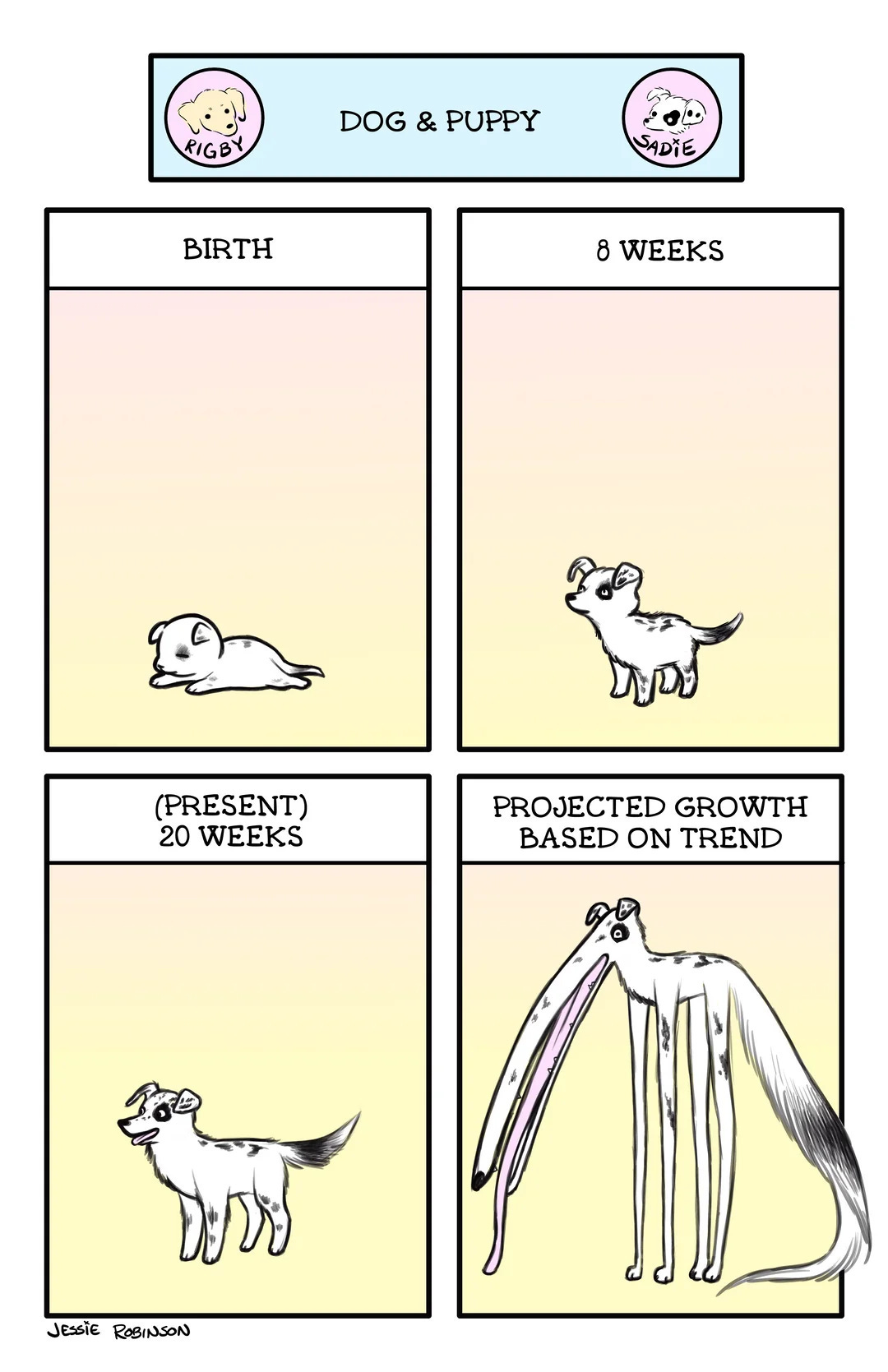 Indudablemente, el relato de Citrini ha merecido varias críticas sosegadas sobre su evidencia empírica y sus hipótesis implícitas, y ha corregido al alza este nuevo episodio inserto en la historia más larga sobre el SaaS apocalypse — el posible derrumbe catastrófico de las empresas de software vendidas como servicio a manos de la IA. El relato rezuma aroma a aquel fenómeno extraterrestre de Welles, con el que la IA parece venir revestida. Sin embargo, la analogía con una inteligencia alienígena sobredimensiona la autonomía de la IA, que hoy sigue siendo infraestructura corporativa bajo gobernanza humana, cuyo futuro depende en realidad de nuestras decisiones. Y extrapola linealmente sus capacidades ignorando los retornos decrecientes y los costes crecientes del escalado. Siempre que leo promesas acerca del crecimiento exponencial, de las leyes de escala, de la inminente singularidad… me viene a la cabeza esta viñeta que representa bien los errores de extrapolar dando por sentado lo que hasta ahora nos había funcionado.