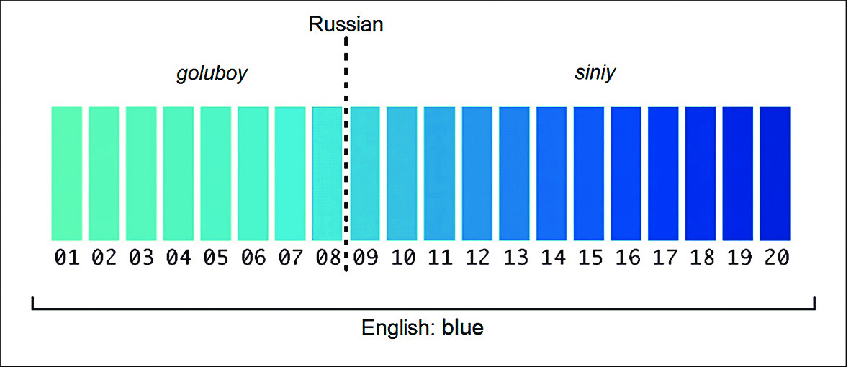 Pero si hay un ejemplo manido para ejemplificar cómo la lengua condiciona el pensamiento e incluso la percepción se halla en los colores. En español se usa el “azul” para un amplio rango cromático, lo que requiere apellidarlo (azul cielo, azul marino, azul turquesa…) o entrar en colores específicos que no suelen presentarse en las conversaciones corrientes (p. ej. añil). Algo semejante sucede en inglés. Pero en ruso se distinguen claramente dos términos: “goluboy” (azul claro verdoso) y “siniy” (azul oscuro).