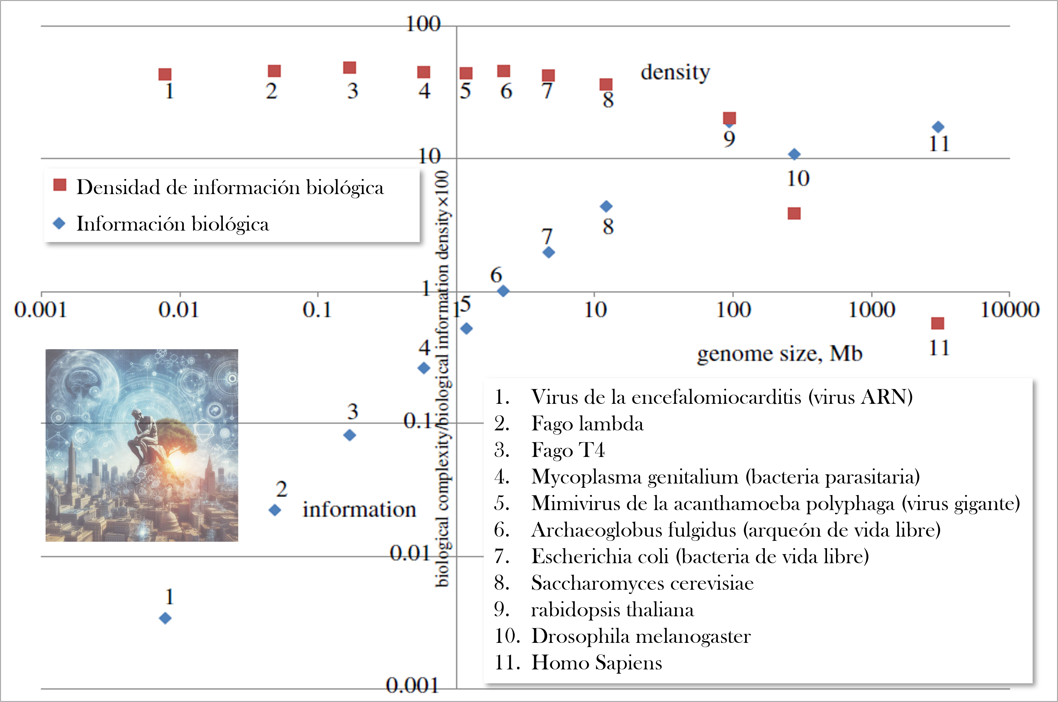 Este cálculo, sin embargo, es solo una aproximación posible porque, en realidad, la información biológica no se limita a la secuencia lineal de nucleótidos, ni los rasgos fenotípicos se corresponden uno a uno con los genes: en la información biológica también intervienen patrones epigenéticos, estructuras tridimensionales del ADN y redes de regulación génica que multiplican la complejidad informativa del sistema. Pero de una forma u otra puede decirse que el ADN es, en cierto sentido, el alfabeto de la vida, en un sentido mucho más profundo que el de un mero texto inerte: es un programa de software que se ejecuta en el contexto de la célula.