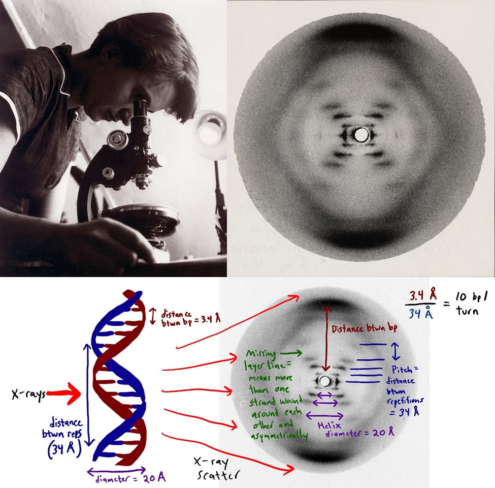 Como es bien conocido, la estructura del ADN fue desentrañada en 1953 por James Watson y Francis Crick y acabó mereciendo el reconocimiento con el premio Nobel de Medicina en 1962. Pero nada de este triunfo habría sido posible sin que una mujer proporcionara, sin reconocimiento alguno durante muchos años, la evidencia que permitió alumbrar la estructura acertada.